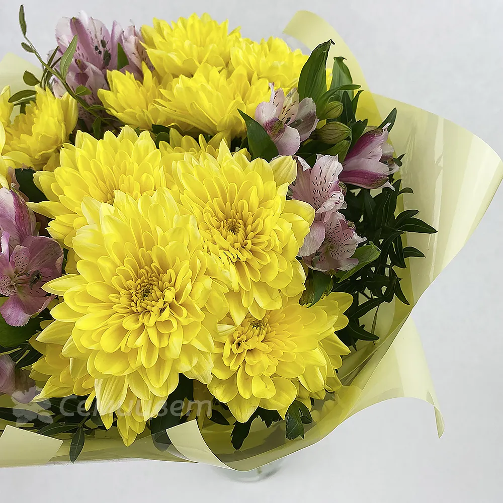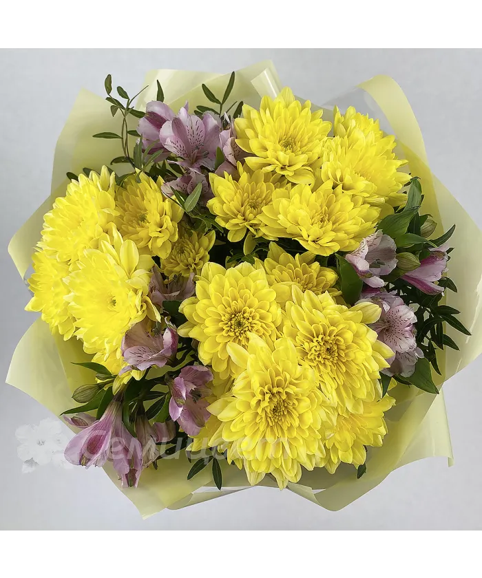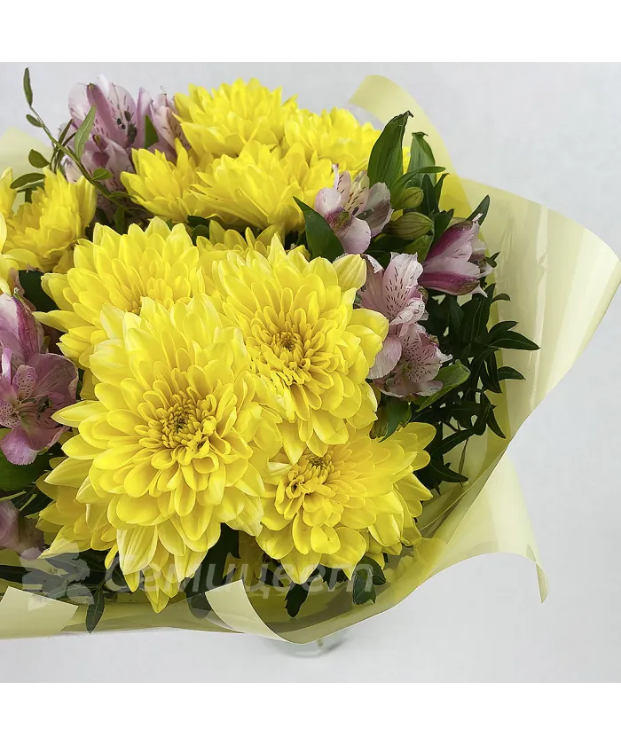 Букет с хризантемами и альстромериями, эти цветы гармонично сочетаются вместе