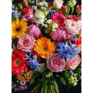 Очаровательный букет, собравший в себе все краски лета! Яркие герберы, нежные розы и полевые цветы создают неповторимую композицию, наполненную теплом и радостью.
